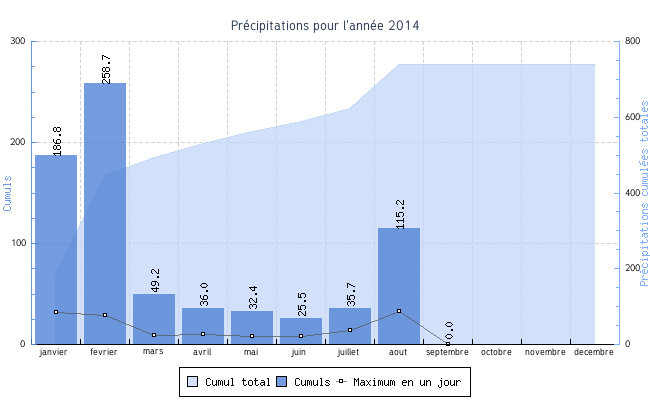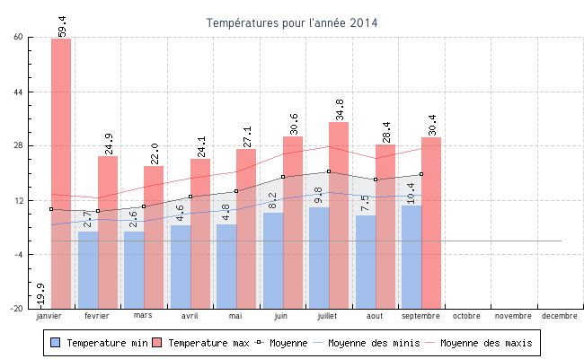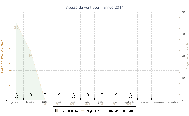| janvier | -19.9 °C | 4.7 °C | 59.4 °C | 13.8 °C | 9.3 °C | 34.9 km/h | 0.0 km/h | SSO |